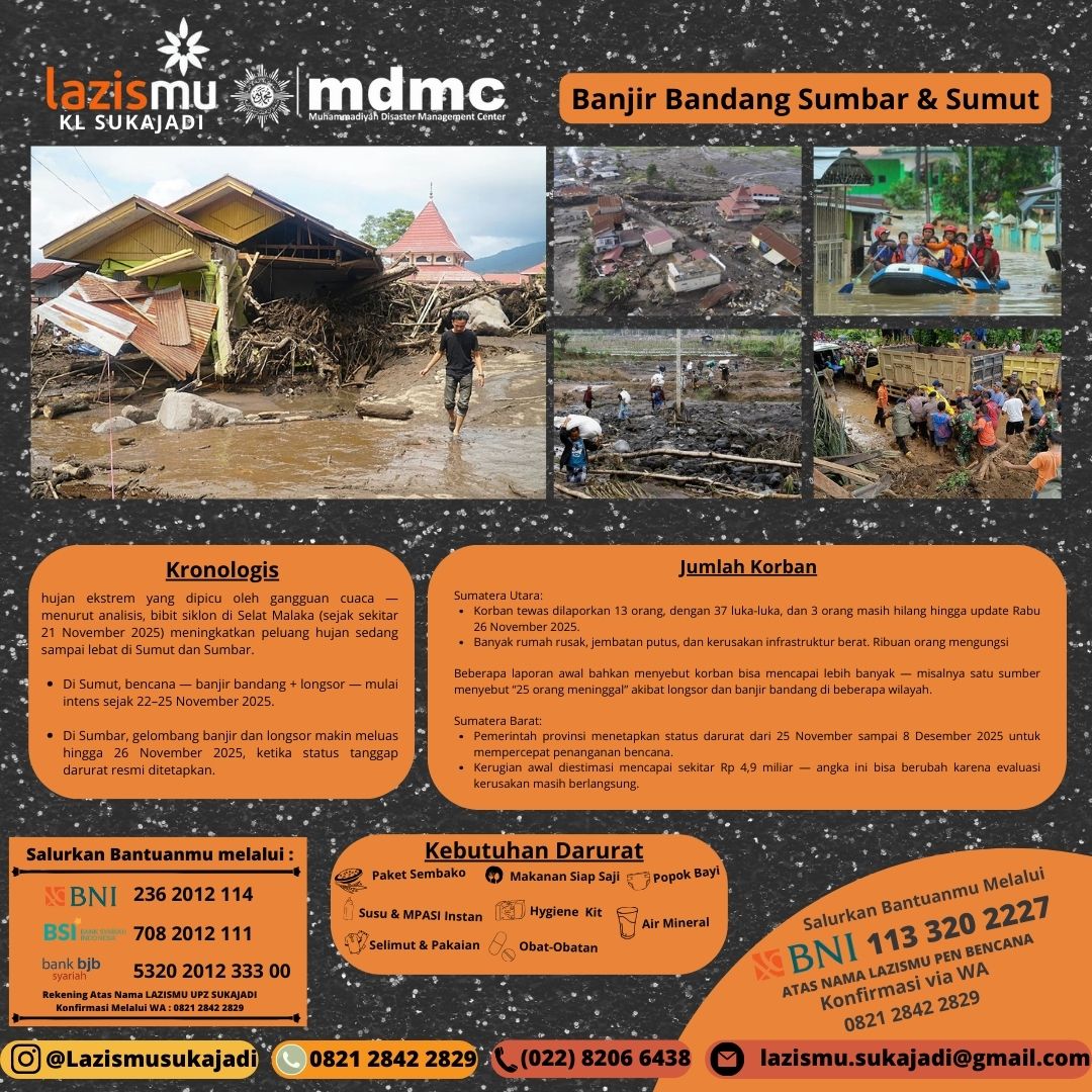 Menindaklanjuti edaran tersebut, Lazismu Kantor Layanan (KL) Sukajadi bergerak cepat mengajak masyarakat untuk berpartisipasi dalam “Aksi Nyata: Bantu Indonesia Pulih Segera” guna meringankan beban ribuan warga terdampak.