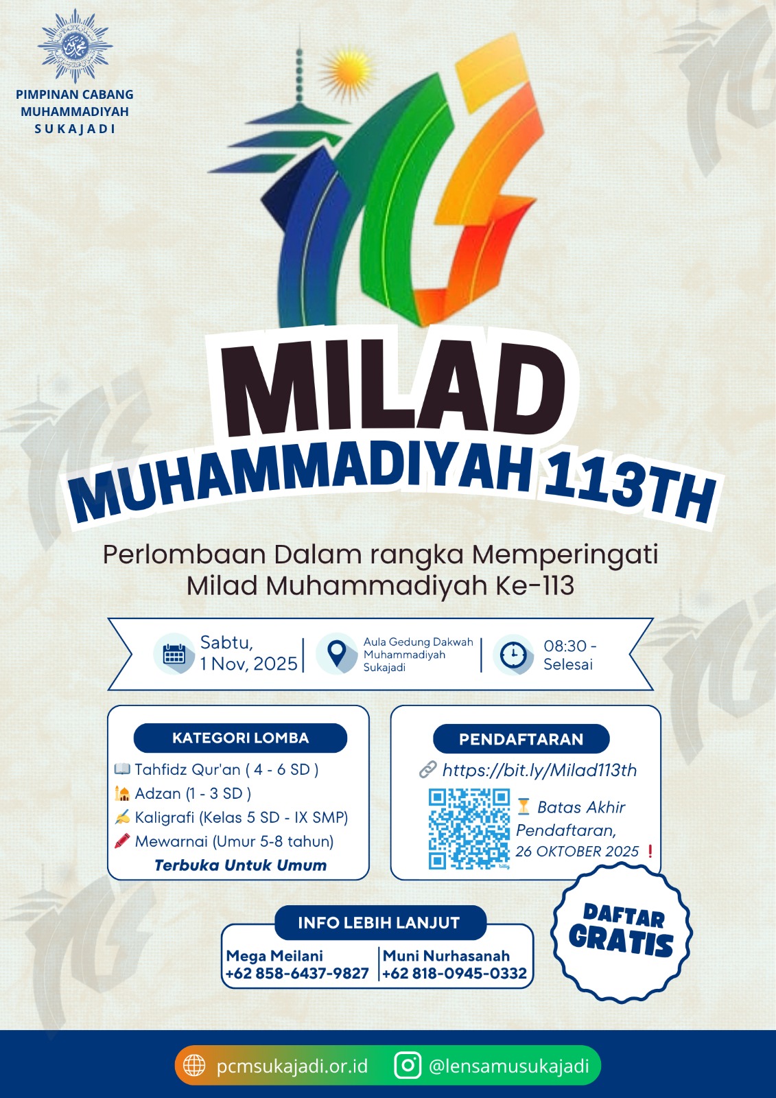 Pimpinan Cabang Muhammadiyah Sukajadi mengonfirmasi penyelenggaraan lomba anak dan pelajar dalam rangka Milad Muhammadiyah ke-113 dengan tema “Memajukan Kesejahteraan Bangsa”. Kegiatan akan dilaksanakan pada Sabtu, 1 November 2025, mulai pukul 08.30 WIB di Aula Lantai 2 Gedung Dakwah Muhammadiyah Sukajadi. Konfirmasi final disampaikan oleh panitia pada 22 Oktober 2025.