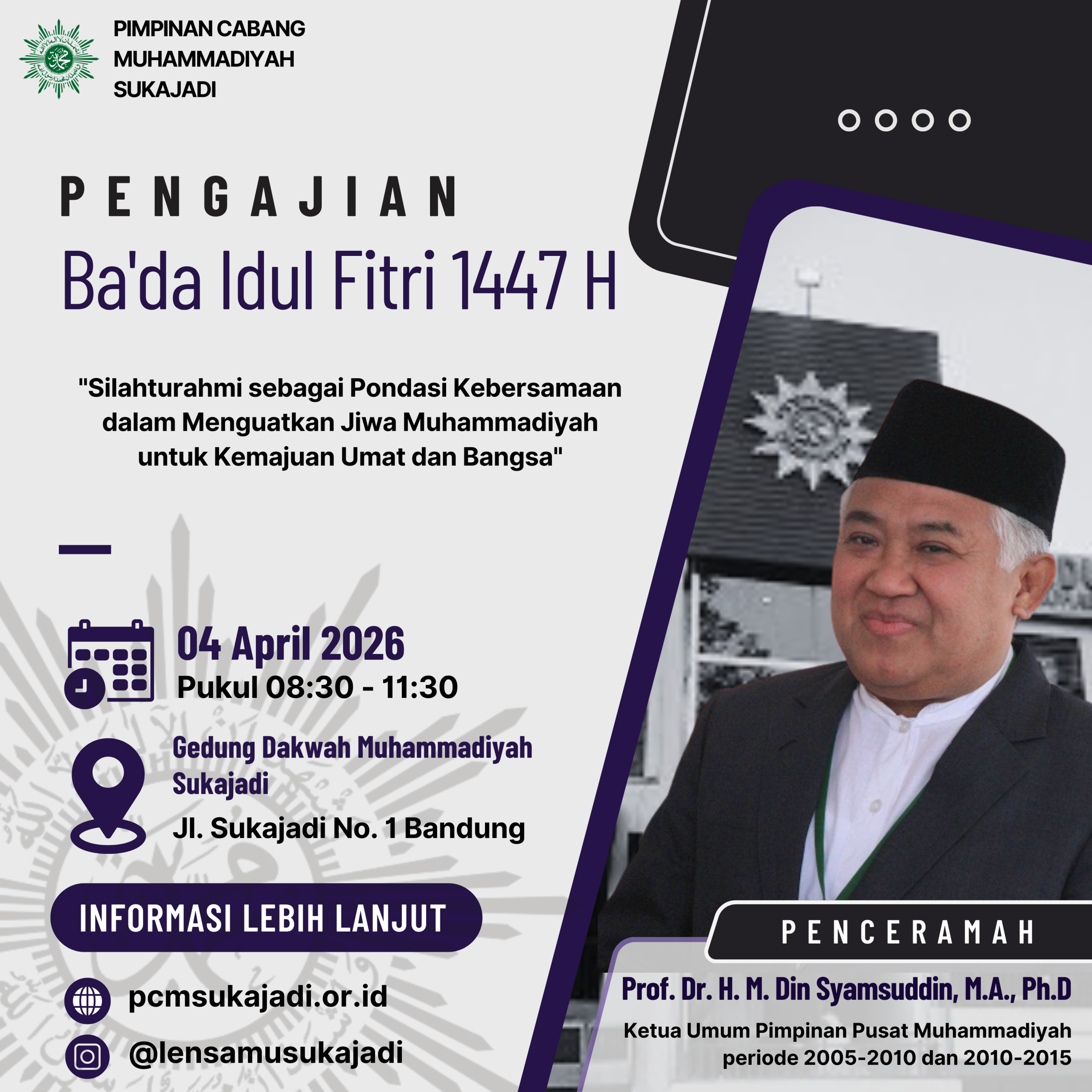 Daya tarik utama dari kegiatan di bulan Syawal 1447 H ini adalah hadirnya penceramah istimewa. Faktanya, panitia secara khusus mengundang tokoh nasional sekaligus mantan Ketua Umum Pimpinan Pusat (PP) Muhammadiyah periode 2005-2015, yaitu Prof. Dr. H. M. Din Syamsuddin, M.A., Ph.D.