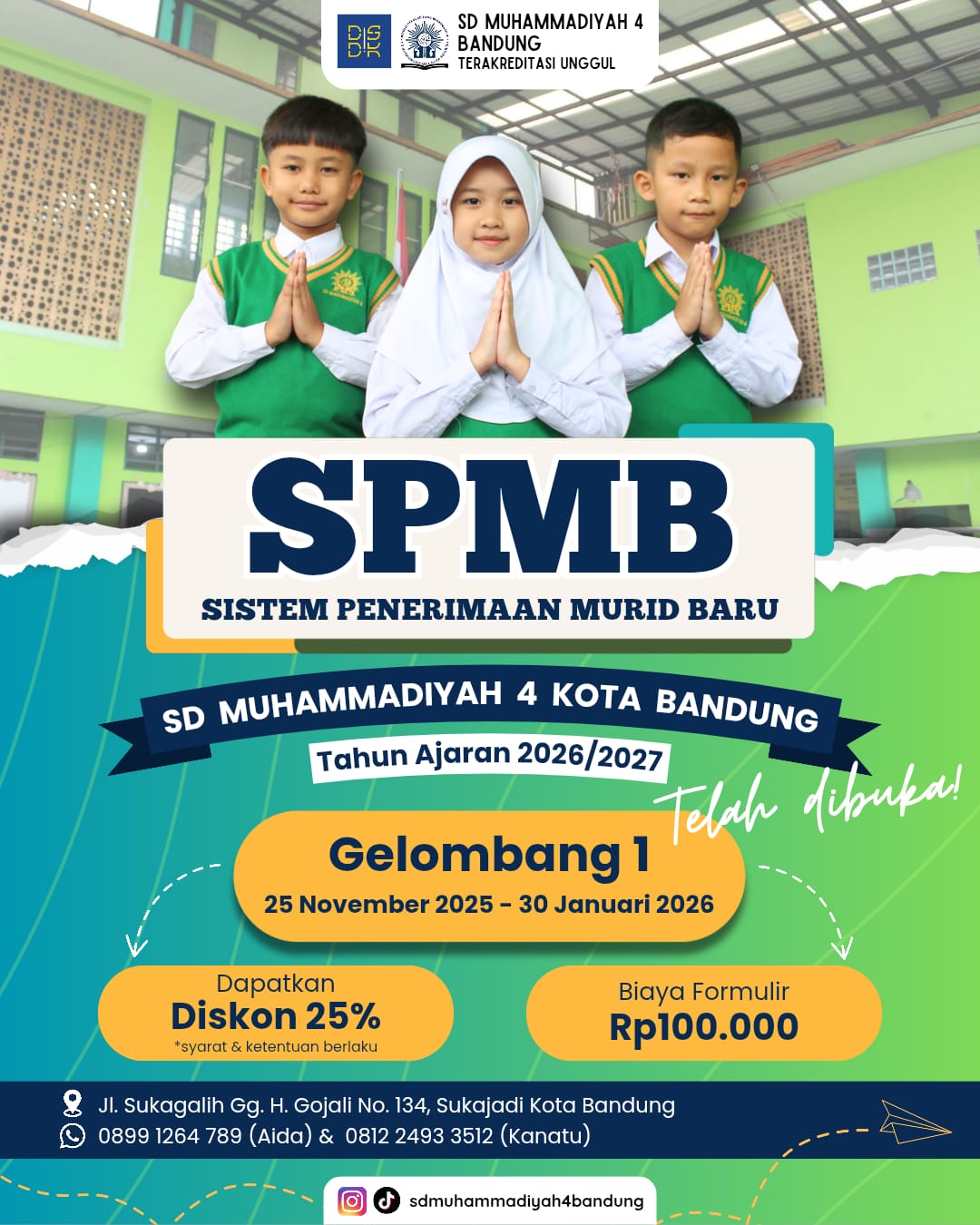 Promo Spesial Gelombang 1 Pendaftaran Gelombang 1 resmi dibuka mulai 25 November 2025 hingga 30 Januari 2026. Pada periode ini, SD Muhammadiyah 4 Bandung memberikan penawaran istimewa berupa Diskon 25% bagi calon siswa yang mendaftar. Kesempatan ini menjadi momen tepat bagi orang tua untuk mengamankan kursi pendidikan berkualitas bagi anak dengan biaya yang lebih efisien.
